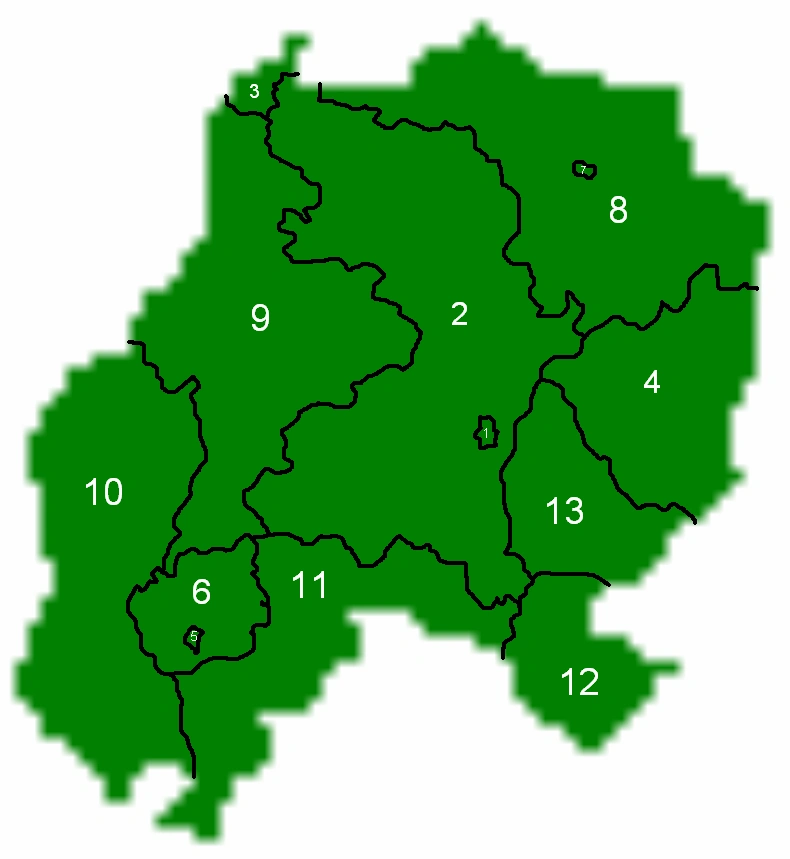 1 - Glavny Hrod Velekohrod, 2 - Velekohrođká Krajina, 3 - Hornopule, 4 - Beluvija, 5 - Nabričahrod, 6 - Nabričija, 7 - Novy Dvor, 8 - Dvornica, 9 - Vinohrođké Zemle, 10 - Čvornica, 11 - Priznania, 12 - Staroselevija, 13 - Srebenija