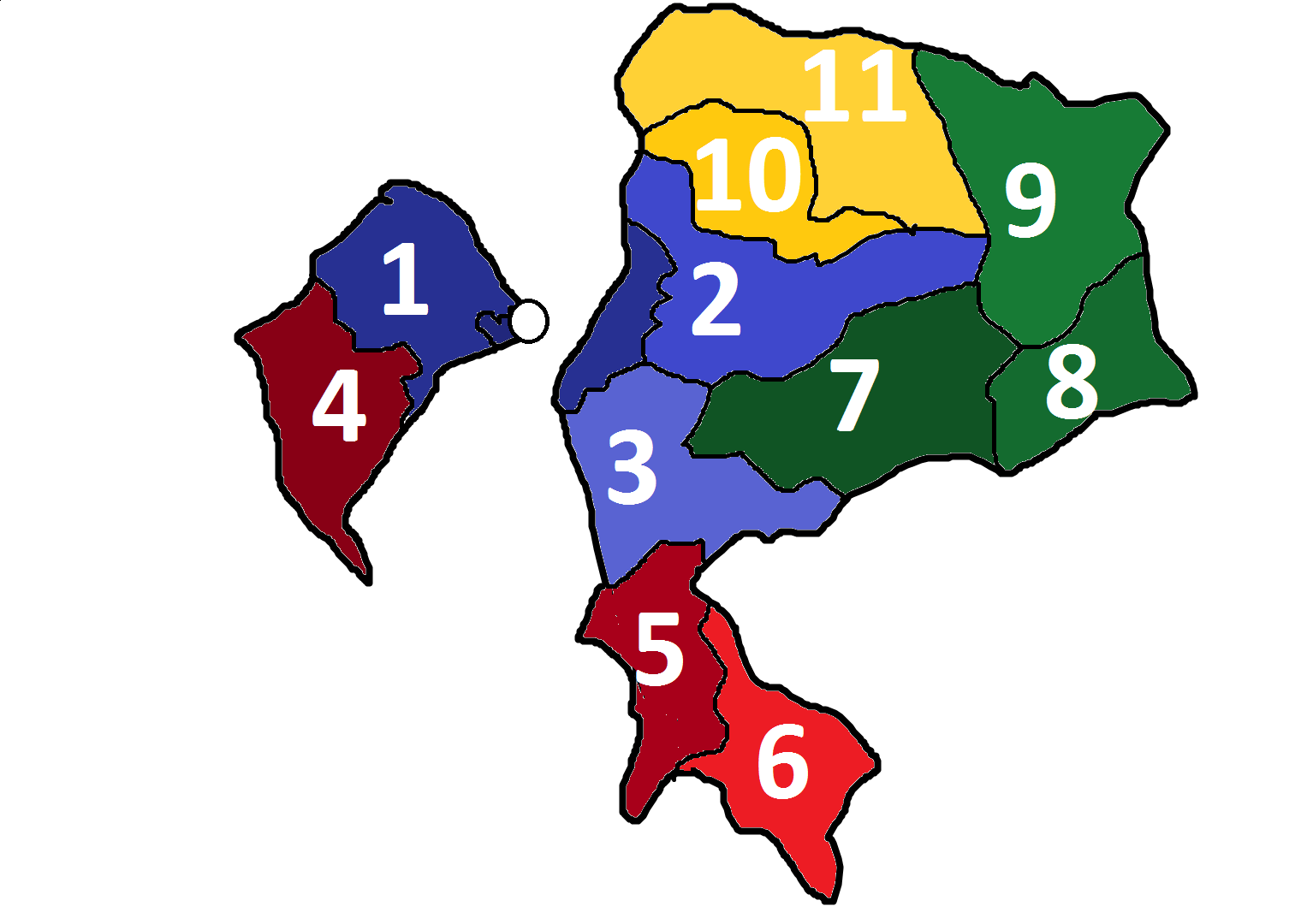 Podział administracyjny: 1-11: regiony Księstwa: Północne - zółty, Jonaskie - czerwony, Grenlandy - zielony, Eliaskie - niebieski