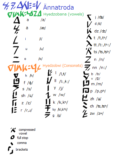 - ㅋ' ㄱ' ㅈ' ㄷ' ㅌ' ㅅ' ㅂ' ㅍ' represent extra sounds because Ännatropa has more consonants then Hangul characters, (the next block determines the vowel and syllable coda). They are ㅋ' ch (ʨ),ㄱ' j (ʥ),ㅈ' zh (ʑ),ㄷ' dz (dz),ㅅ' sh (ɕ),ㄷ' ts (ts), ㅂ' v (β) ㅍ'f (ɸ). Ex. 갸' is Jya (/ʥja/ toy, to play).