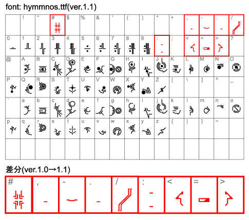 Hymmnos glyphs. Updated to the 1.1 version (borrowed from http://hymmno-dict.com)