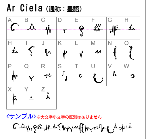 However, there is also a secondary script known as the Ar Ciela Script, which is used to write the Ar Ciela language, as well as for writing the Carmena Foreluna language. However, the latter can also be written in normal Hymmnos script.