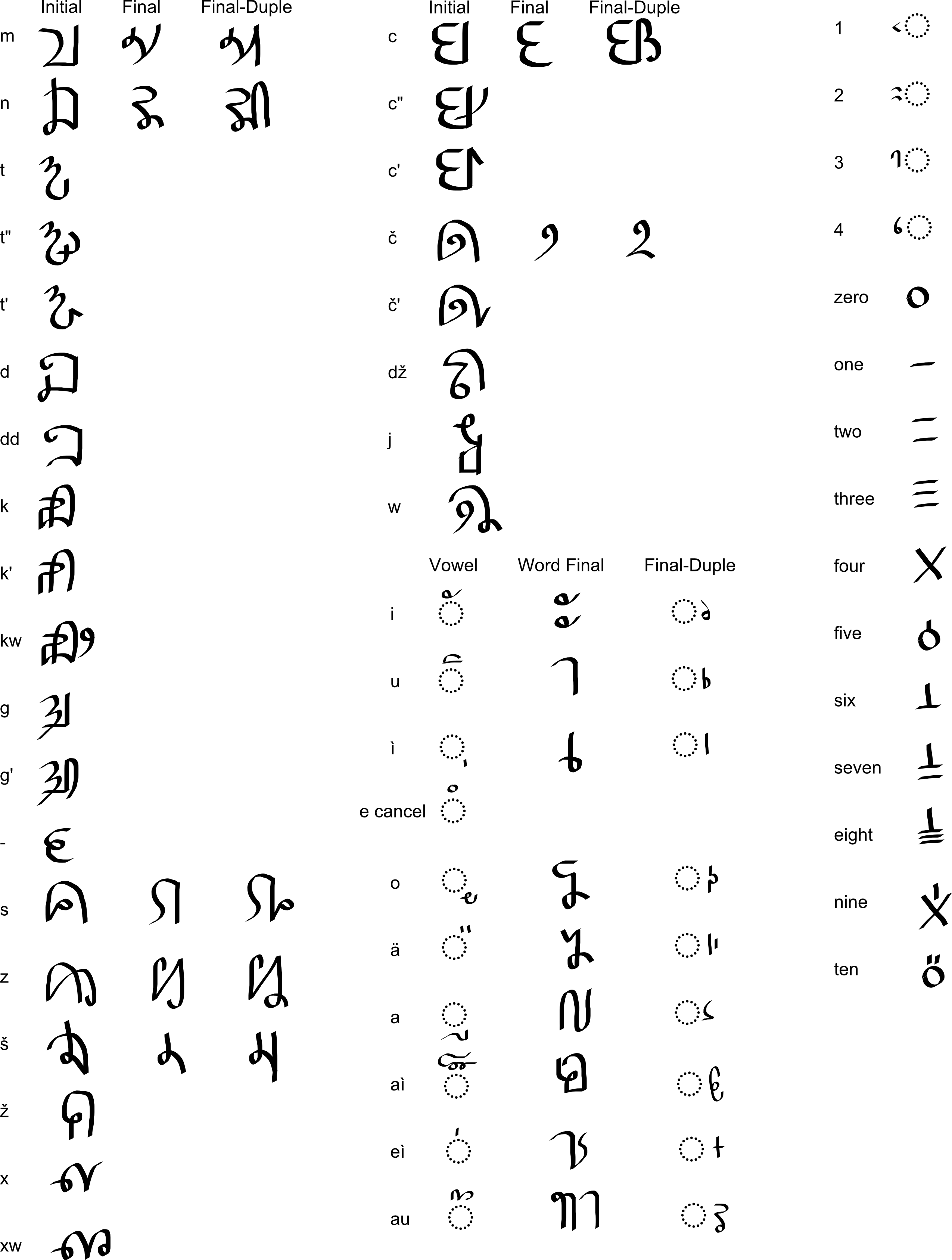 Dduzdoddeč is the only extant writing system of Mentekan, the name of which is the verb to make one understand. Dduzdoddeč is an abugida with 27 consonant characters, 14 final consonant characters, 10 vowel diacritics, 18 vowel final characters/diacritics, 4 tone diacritics, and 11 number logographs. The consonants with the capability to be finals get separate final characters, and if the initial of the next syllable is the same, the final character becomes a final-duple character. The vowels get characters if they are the final of a word, and have different diacritics when attached to a final-duple. The consonants have an inherent vowel of /e/.