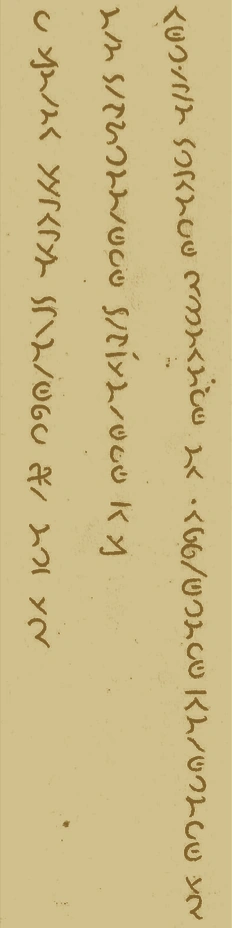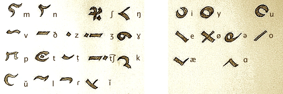 The Shaj people devised their own alphabet. Unlike adaptations for natural scripts, Shajchoten do not distinguish voicing in fricatives. Below is an image showing the letters' serif forms. Sentences are written top to bottom, right to left.