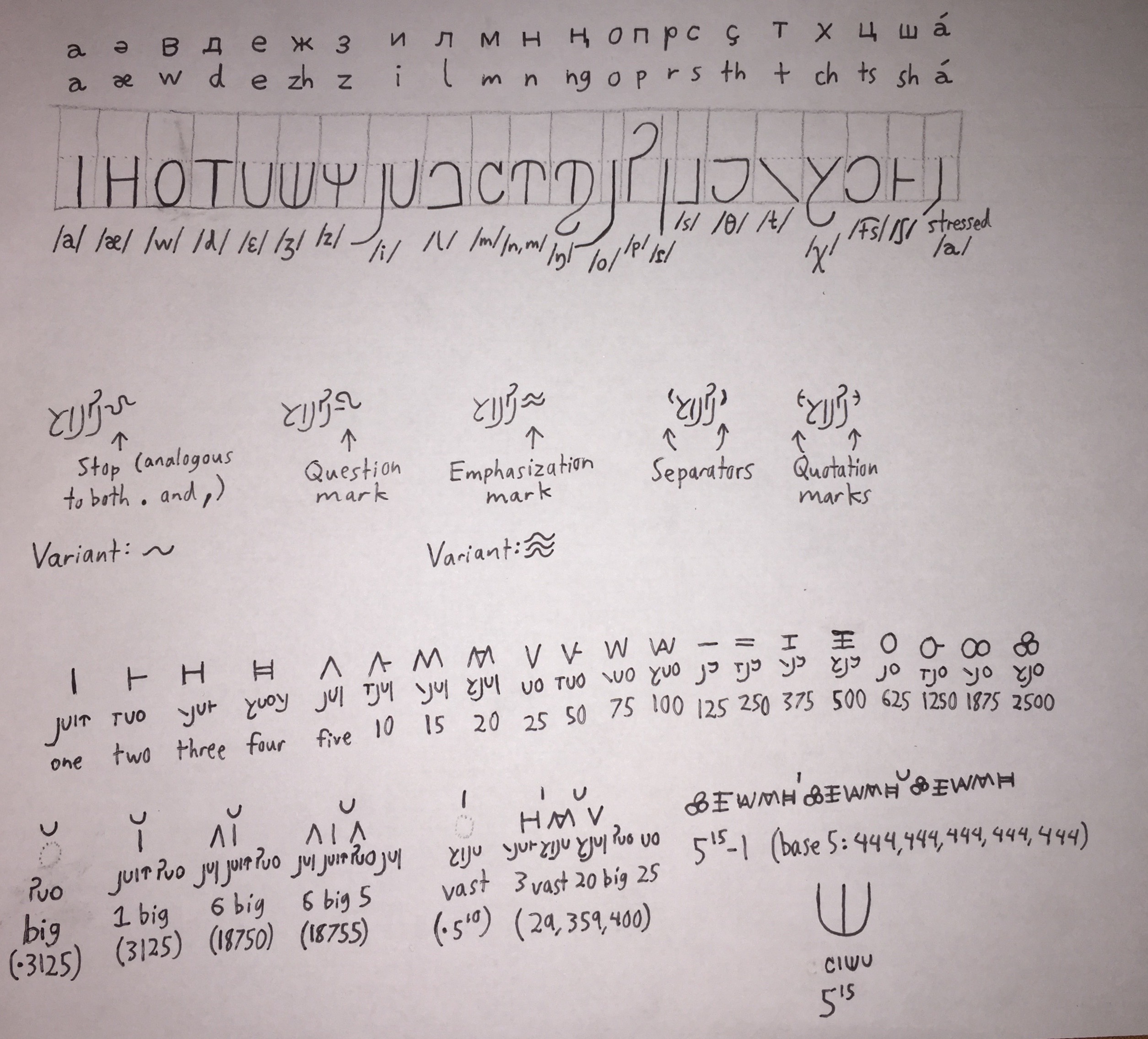 There are 20 numerals used in Tson plus one symbol that represents 5 to the power of 15. The number system is base 5, and there are different numerals and words for numbers in the first five places. For example, 125 (1000 in base 5) is оҫ / oth, while 5 (10 in base 5) is written with a separate numeral, ир / ir. Powers of 5 from 55 to 59 are written with the same twenty numerals with a symbol, пэв / pew, added after. Powers of 5 from 510 to 514 are written with the 20 numerals with a symbol, хри / chri, added after, while 515 has its own symbol, called мажэ / mazhe.